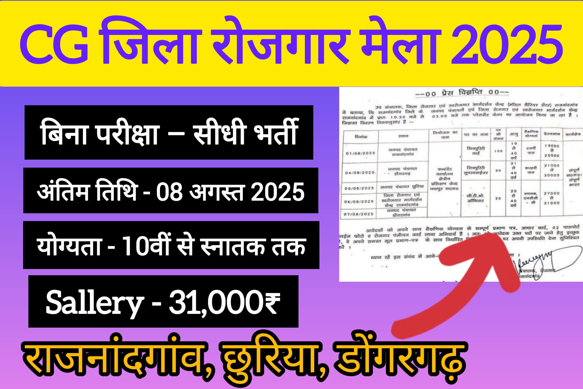 CG District Job Fair 2025: छत्तीसगढ़ के युवाओं के लिए अगस्त 2025 में सरकारी और प्राइवेट नौकरियों का सुनहरा मौका आया है। जिला रोजगार एवं स्वरोजगार मार्गदर्शन केंद्र (मॉडल करियर सेंटर), राजनांदगांव द्वारा जिला रोजगार मेला 2025 आयोजित किया जा रहा है, जिसमें कई कंपनियाँ भाग लेंगी और विभिन्न पदों पर सीधी भर्ती (Walk-in Interview) की जाएगी।