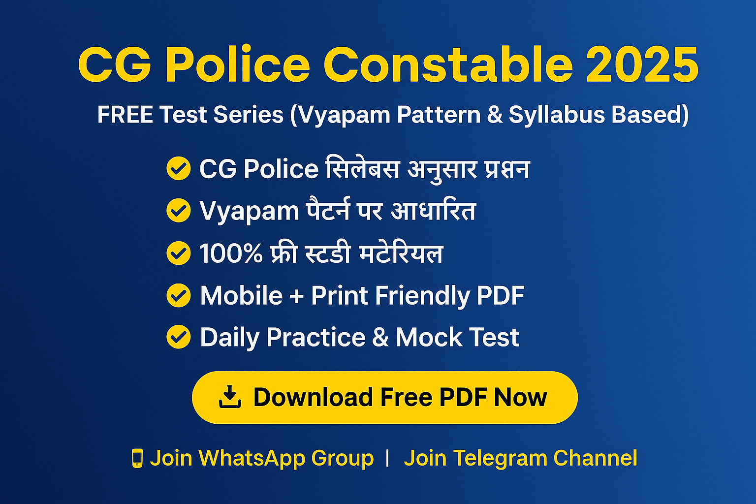 CG Police Constable Free Test Series 2025: क्या आप छत्तीसगढ़ पुलिस कांस्टेबल भर्ती 2025 की तैयारी कर रहे हैं?क्या आप चाहते हैं कि आपकी तैयारी एकदम परीक्षा के पैटर्न पर आधारित हो?तो आपके लिए सबसे बेहतरीन खबर है कि CG Education Hub लेकर आया है एकदम फ्री टेस्ट सीरीज, जो विशेष रूप से CG Police Bharti 2025 के सिलेबस और Vyapam पैटर्न पर आधारित है।
