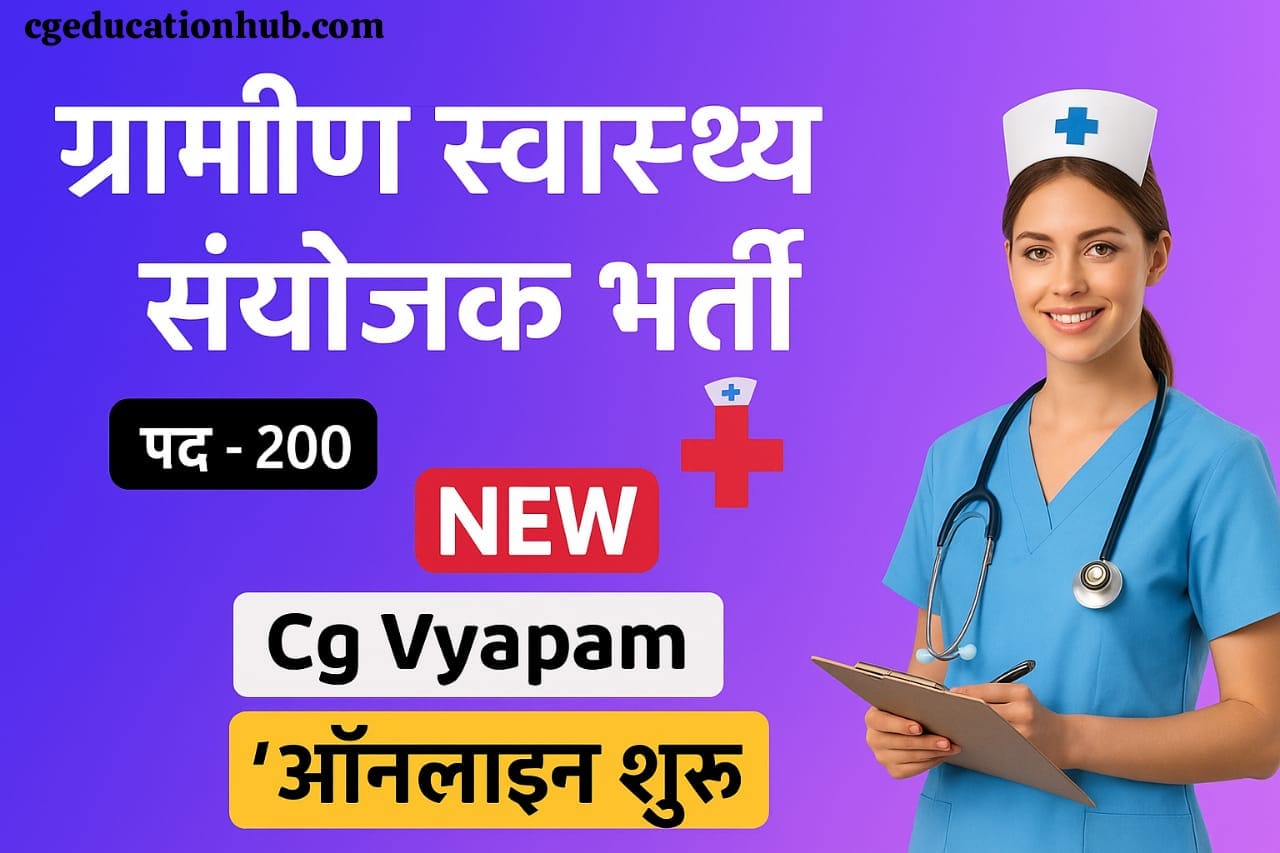 CG Vyapam Gramin Swasthy Sanyojak Bharti: छत्तीसगढ़ स्वास्थ्य विभाग ने ग्रामीण क्षेत्रों के लिए स्वास्थ्य संयोजक (महिला एवं पुरुष) के 200 पदों पर सीधी भर्ती की घोषणा की है। छत्तीसगढ़ व्यापम के माध्यम से यह रोजगार अवसर उन युवा अभ्यर्थियों के लिए है जो स्वास्थ्य क्षेत्र में सरकारी नौकरी पाना चाहते हैं। इस आर्टिकल में ऑनलाइन आवेदन प्रक्रिया से लेकर पात्रता, आयु सीमा, आवेदन शुल्क, चयन प्रक्रिया, सैलरी और जरूरी दस्तावेज से जुड़ी सभी महत्वपूर्ण जानकारी विस्तार से दी जा रही है।