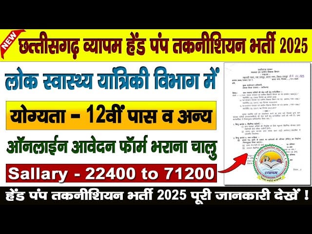 CG Vyapam Handpump Technician Recruitment 2025: छत्तीसगढ़ राज्य के लोक स्वास्थ्य यांत्रिकी विभाग के अंतर्गत CG Vyapam द्वारा हैंडपंप तकनीशियन पदों पर भर्ती प्रक्रिया शुरू की गई है। इच्छुक उम्मीदवारों को ऑनलाइन माध्यम से आवेदन देने का मौका मिलेगा, जिसमें सभी महत्वपूर्ण बिंदु, चयन प्रक्रिया, आयु सीमा, योग्यता, सिलेबस और अन्य जानकारी विस्तार से दी जा रही है।