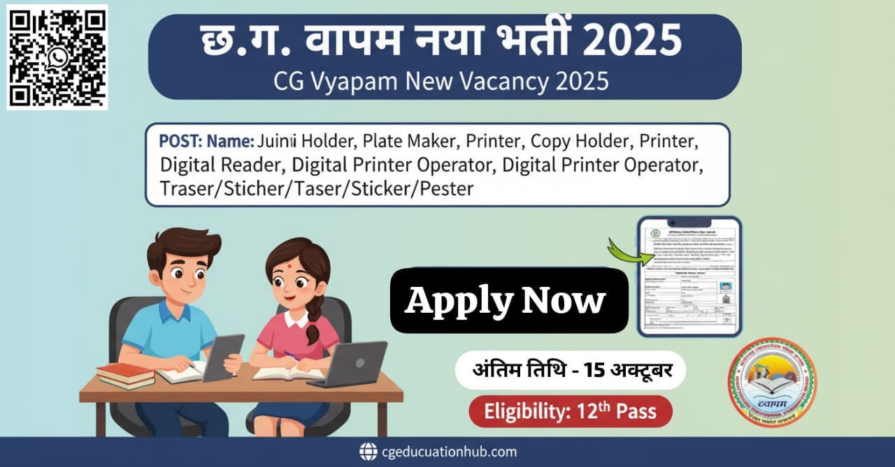 CG Vyapam Recruitment 2025 (MLGI25): छत्तीसगढ़ व्यावसायिक परीक्षा मंडल (CG Vyapam) ने मुद्रण तथा लेखन सामग्री विभाग भर्ती 2025 (MLGI25) के लिए आधिकारिक विज्ञापन और परीक्षा निर्देश जारी कर दिए हैं। यह भर्ती उन युवाओं के लिए शानदार अवसर है जो तकनीकी क्षेत्र से जुड़े सरकारी पदों पर कार्य करना चाहते हैं। इस लेख में हम आपको भर्ती से संबंधित सभी महत्वपूर्ण जानकारियाँ देंगे जैसे – पदों का विवरण, योग्यता, आयु सीमा, आवेदन प्रक्रिया, शुल्क, परीक्षा पैटर्न, सिलेबस और चयन प्रक्रिया।