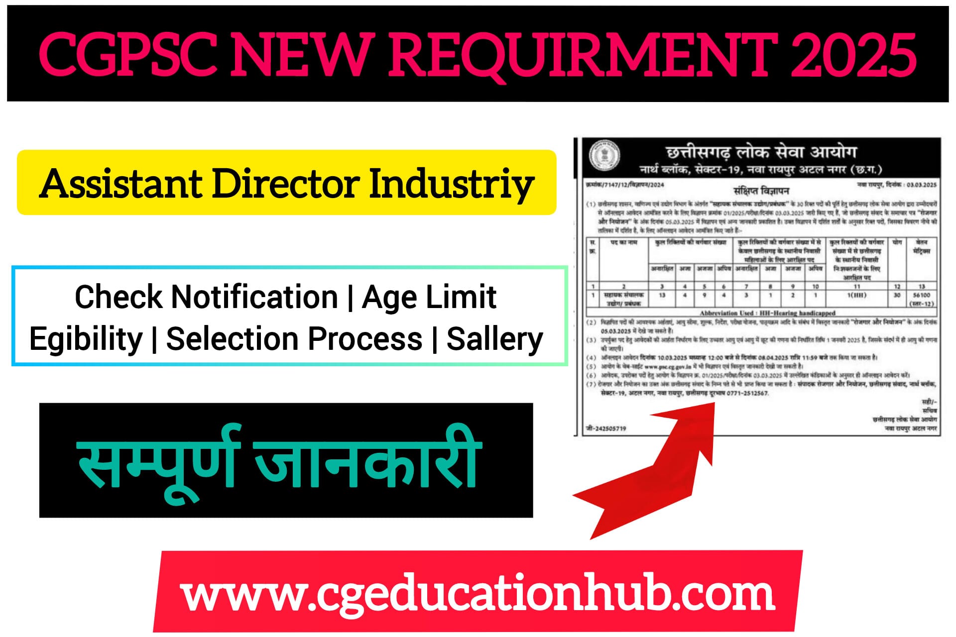 छत्तीसगढ़ लोक सेवा आयोग (CGPSC) ने सहायक संचालक उद्योग / प्रबंधक (वाणिज्य एवं उद्योग विभाग) के पदों पर भर्ती के लिए आधिकारिक अधिसूचना जारी की है। यह भर्ती छत्तीसगढ़ राज्य सरकार के अंतर्गत आती है और योग्य उम्मीदवारों को एक प्रतिष्ठित सरकारी पद पर कार्य करने का अवसर प्रदान करती है।इस भर्ती के माध्यम से राजपत्रित द्वितीय श्रेणी अधिकारी के रूप में नियुक्ति दी जाएगी, जो राज्य के औद्योगिक और वाणिज्यिक विकास में महत्वपूर्ण भूमिका निभाएंगे। इस पद पर चयनित उम्मीदवारों को राज्य में उद्योगों के विकास, व्यापार नीति निर्माण और निवेश प्रोत्साहन से संबंधित कार्य सौंपे जाएंगे।यह भर्ती उन उम्मीदवारों के लिए एक शानदार अवसर है जो इंजीनियरिंग, एमबीए, अर्थशास्त्र, वाणिज्य, भौतिकी या रसायन शास्त्र जैसे विषयों में विशेषज्ञता रखते हैं और सरकारी क्षेत्र में एक स्थायी और सम्मानजनक नौकरी चाहते हैं।छत्तीसगढ़ लोक सेवा आयोग (CGPSC) द्वारा आयोजित यह परीक्षा प्रतिस्पर्धात्मक होगी और इसमें लिखित परीक्षा तथा साक्षात्कार के आधार पर उम्मीदवारों का चयन किया जाएगा। इच्छुक अभ्यर्थी 10 मार्च 2025 से 08 अप्रैल 2025 तक ऑनलाइन आवेदन कर सकते हैं।इस भर्ती से संबंधित योग्यता मानदंड, चयन प्रक्रिया, परीक्षा पैटर्न, वेतनमान और आवेदन प्रक्रिया की पूरी जानकारी नीचे दी गई है। इच्छुक उम्मीदवारों को सलाह दी जाती है कि वे अंतिम तिथि से पहले अपना आवेदन पूरा कर लें और आधिकारिक अधिसूचना को ध्यानपूर्वक पढ़ें।
