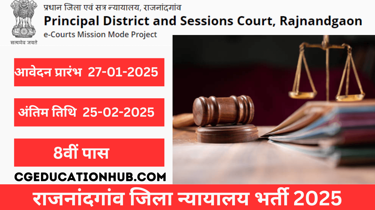 Rajnandgaon Court Vacancy 2025| “राजनांदगांव जिला न्यायालय ने 2025 में विभिन्न पदों के लिए भर्ती की घोषणा की है, जो छत्तीसगढ़ के उम्मीदवारों के लिए एक बेहतरीन अवसर है। यदि आप भी सरकारी नौकरी की तलाश में हैं और छत्तीसगढ़ में काम करने के इच्छुक हैं, तो यह भर्ती आपके लिए एक सुनहरा मौका हो सकता है। इस भर्ती में आवेदन करने के लिए आपको कुछ जरूरी पात्रता मानदंड और आवेदन प्रक्रिया को समझना होगा। इस लेख में हम आपको पूरी जानकारी देंगे, जैसे कि भर्ती में उपलब्ध पदों, पात्रता की शर्तों, आवेदन कैसे करें, चयन प्रक्रिया के बारे में विस्तृत जानकारी, और इस भर्ती से जुड़ी महत्वपूर्ण तिथियां। इसके अलावा, हम आपको इस भर्ती से संबंधित सभी अहम जानकारियाँ प्रदान करेंगे ताकि आप आसानी से आवेदन कर सकें और इस शानदार अवसर का लाभ उठा सकें।”